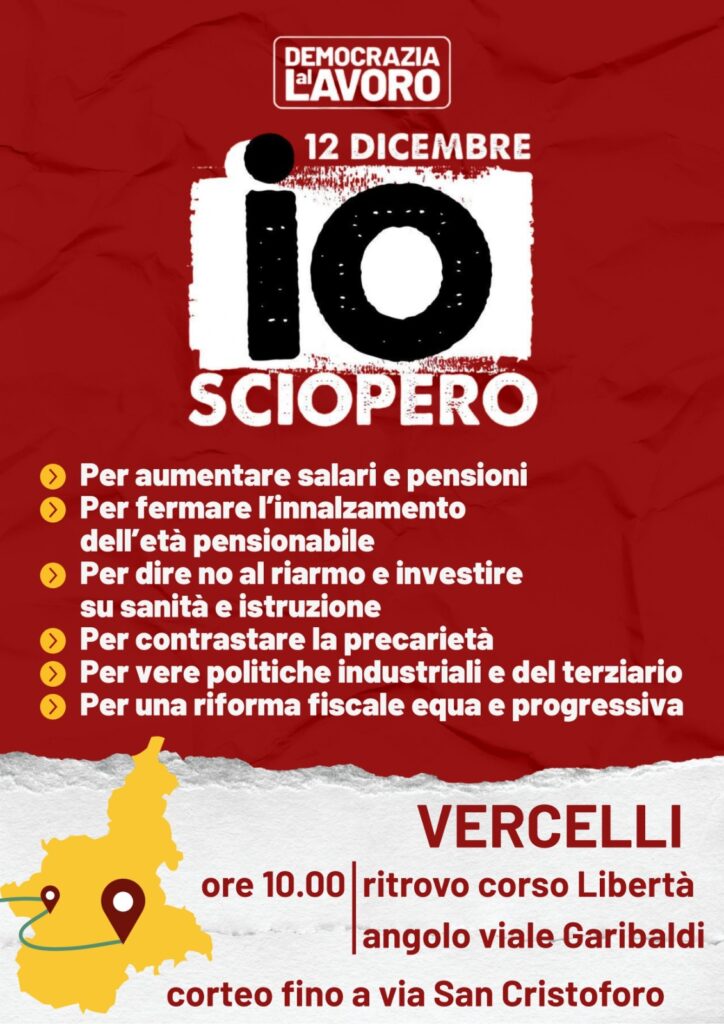 “Il Paese è fermo, i salari e le pensioni arretrano, la sanità e i servizi pubblici vengono tagliati, mentre cresce la precarietà e si alza l’età pensionabile. La manovra di bilancio dell’attuale Governo non risponde alle vere urgenze sociali: non restituisce il potere d’acquisto perso, non sostiene l’occupazione di qualità, non investe su industria e giovani. A pagare i conti sono ancora una volta lavoratrici, lavoratori e pensionati, mentre aumentano le spese militari, i condoni e i regali fiscali a chi ha di più”, così il Segretario Generale della CGIL Vercelli Valsesia, Valter Bossoni, sullo sciopero generale proclamato dalla CGIL per il prossimo venerdì, 12 dicembre.
